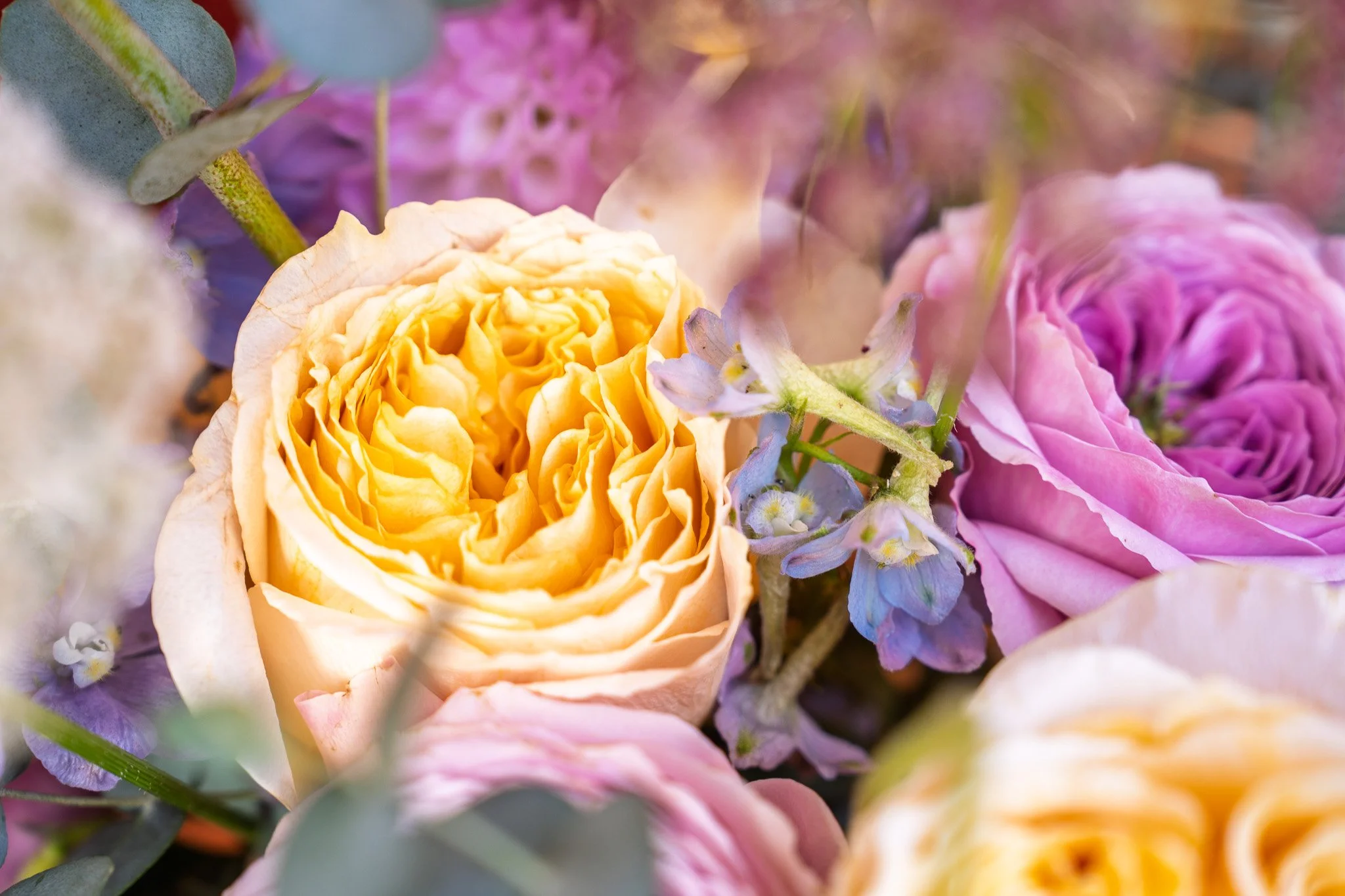 Close-up of a bouquet with yellow and pink roses, purple flowers, and green foliage.
